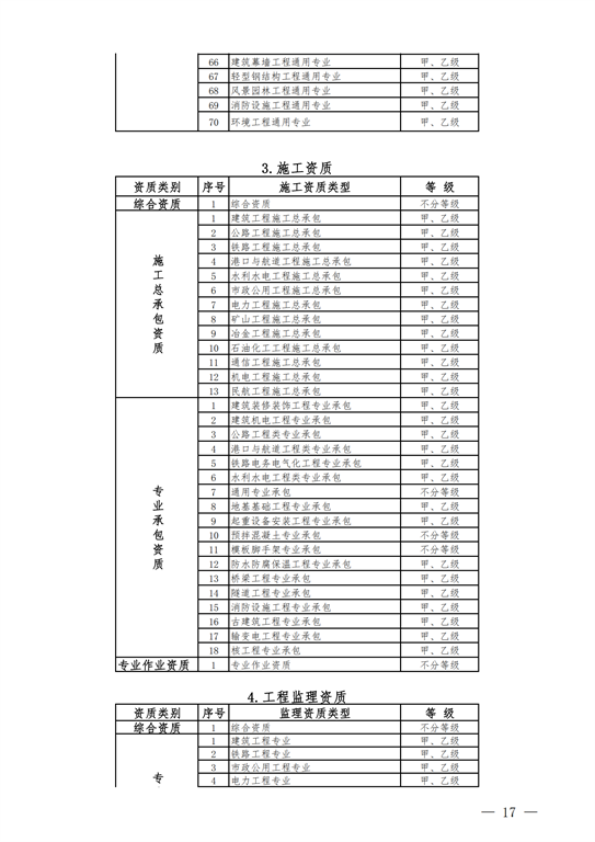 2.工程設(shè)計(jì)資質(zhì)。保留綜合資質(zhì);將21類行業(yè)資質(zhì)整合為14類行業(yè)資質(zhì);將151類專業(yè)資質(zhì)、8類專項(xiàng)資質(zhì)、3類事務(wù)所資質(zhì)整合為70類專業(yè)和事務(wù)所資質(zhì)。綜合資質(zhì)、事務(wù)所資質(zhì)不分等級(jí);行業(yè)資質(zhì)、專業(yè)資質(zhì)等級(jí)原則上壓減為甲、乙兩級(jí)(部分資質(zhì)只設(shè)甲級(jí))。
